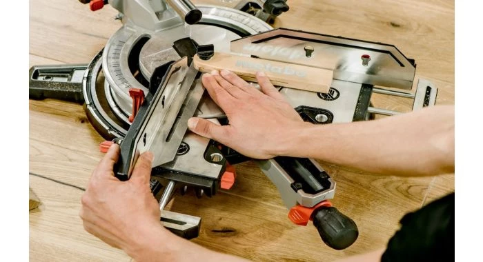 Combinaison unique et brevetée d’une scie pour plinthes avec fonction radiale et d’une scie à plinthes avec système de butée à réglage symétrique